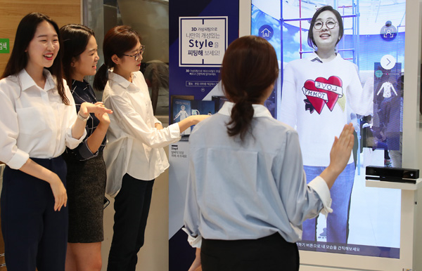5일 오후 서울 중구 롯데백화점 본점 지하 1층에서 직원들이 3D 가상 피팅 서비스를 체험해보고 있다. 고객들은 디지털 장비를 이용해 매장에서 직접 옷을 입지 않아도 입었을 때의 모습을 확인할 수 있다. 현재 3개 브랜드 15개 품목에 대해 가상 피팅 서비스가 제공된다. 롯데백화점 관계자는 올해 연말까지 가상 피팅 서비스를 20여 개 브랜드 150개 이상 품목으로 확대하고 스마트폰을 이용한 상품 주문기능까지 선보일 예정이라고 밝혔다./연합뉴스