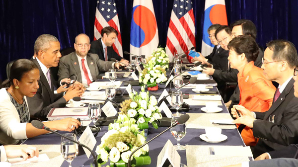 박근혜 대통령과 오바마 미국 대통령이 6일 오후(현지시간) 아세안 정상회의 참석차 방문한 라오스 비엔티안에서 한·미 확대정상회담을 하고 있다./연합뉴스