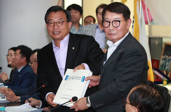 새누리당 이정현 대표(왼쪽)가 8일 오후 서울 남대문로5가 직능경제인단체총연합회를 찾아 오호석 총회장으로부터 각 직능단체 정책 건의서를 전달받고 있다./연합뉴스