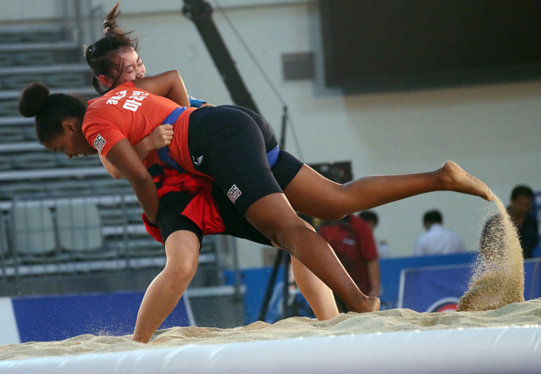 13일 서울 장충체육관에서 열린 2016 추석장사 씨름대회 외국인 여자 학교대항전에서 경희대학교 마리안(오른쪽)과 숭실대학교 효홍이 경기를 펼치고 있다./연합뉴스