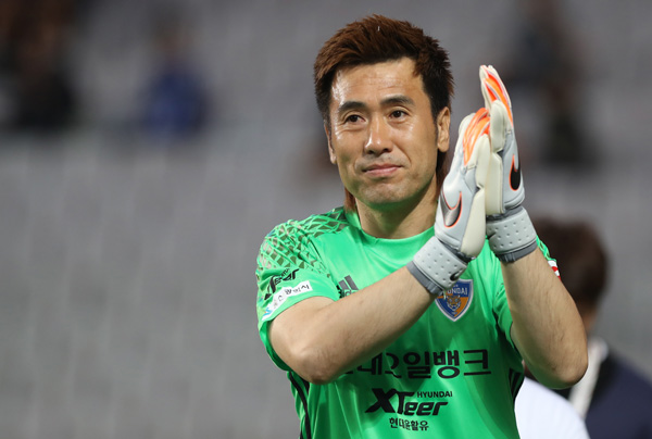 18일 울산 문수축구경기장에서 열린 프로축구 K리그 클래식 울산 현대와 포항 스틸러스의 경기. 이날 은퇴식을 하는 김병지가 경기 시작에 앞서 관중들에게 인사를 하고 있다./연합뉴스
