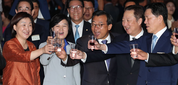 19일 오후 서울 여의도 63컨벤션에서 열린 대한상공회의소 주최 ‘20대 국회의원 환영리셉션’에서 여야 대표들이 건배하고 있다. 왼쪽부터 정의당 심상정 대표, 더불어민주당 추미애 대표, 새누리당 이정현 대표, 박용만 대한상의 회장, 국민의당 주승용 비상대책위원장 직무대행./연합뉴스