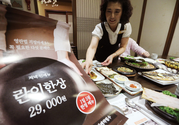 ‘김영란법’(부정청탁 및 금품 등 수수의 금지에 관한 법률) 시행을 6일 앞둔 22일 서울 종로구 해우리 광화문점에서 직원이 ‘김영란 정식’을 선보이고 있다. 해초바다요리브랜드 해우리는 1인 기준 2만9000원인 해우리 저녁 특정식 ‘란이한상’을 오는 29일부터 판매한다. /연합뉴스