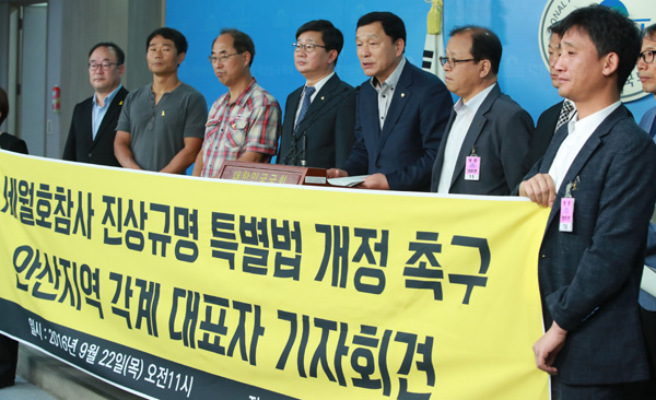 더불어민주당 김철민 의원(안산상록을)과 전해철(안산상록갑) 의원이 22일 오후 서울 여의도 국회 정론관에서 안산지역 각계 대표자들과 함께 세월호참사 진상규명 특별법 개정을 촉구하는 기자회견을 하고 있다./연합뉴스