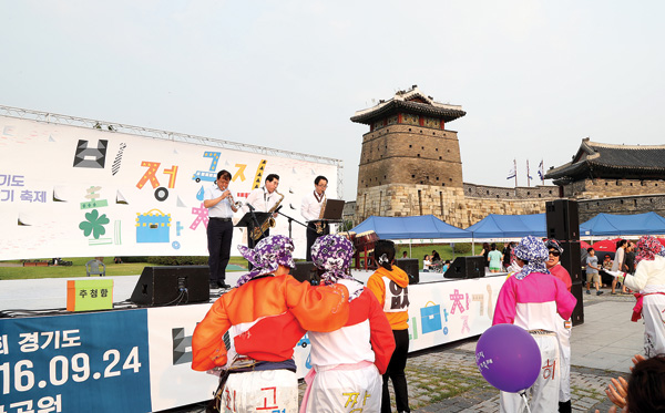 경기도의회 정기열 의장(더불어민주당·안양4)이 지난 24일 수원 장안공원(서문) 중앙무대에서 열린 ‘2016 제3회 비정규직 희망찾기 축제’에 참석해 김상돈(더민주·의왕1), 장현국(더민주·수원7) 도의원과 함께 오프닝 색소폰 축하공연을 하고 있다./경기도의회 제공