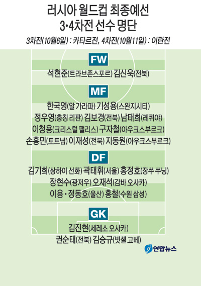 대표팀은 내달 3일 수원에서 소집돼 6일 오후 8시 수원월드컵경기장에서 카타르와 최종예선 3차전을 치른 뒤 이란 테헤란으로 떠나 오는 한국시간으로 11일 오후 11시45분 이란과 최종예선 4차전을 펼친다.
