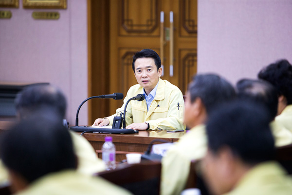 남경필 경기도지사가 26일 도청 신관4층 제1회의실에서 을지훈련 민간평가단 및 관련 공무원 등과 ‘2016 을지연습 종합 강평보고회의 및 TF토의’를 하고 있다. /경기도 제공