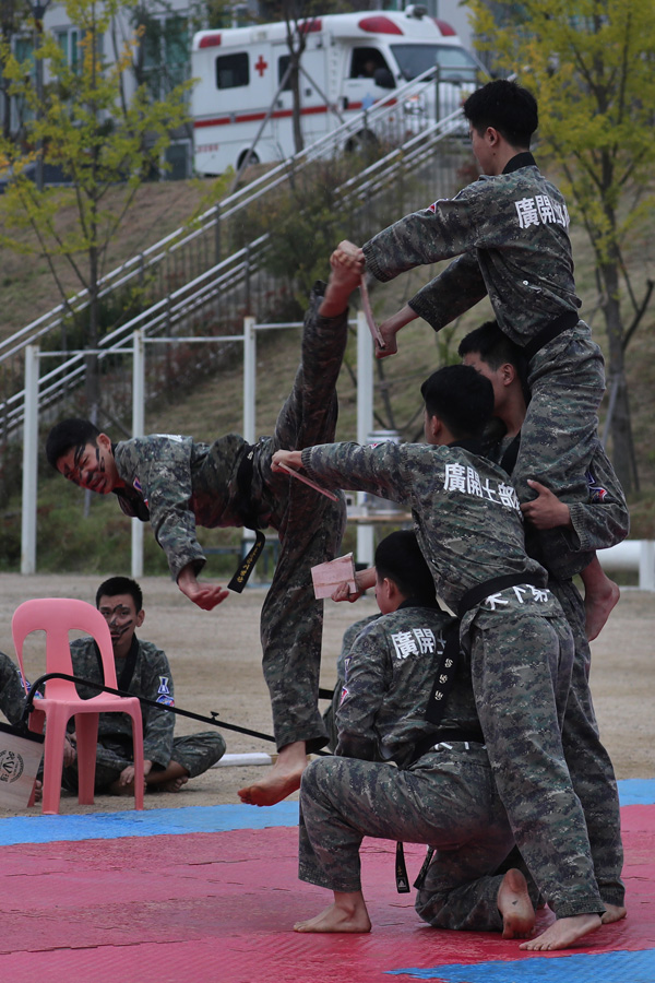 27일 고양시에서 열린 1군단 호국문예행사에서 1군단 태권도팀이 격파 시범을 선보이고 있다. /연합뉴스