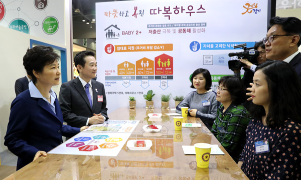 박근혜 대통령이 28일 경기도 고양시 킨텍스에서 열린 2016 지역희망 박람회 경기도 부스에서 남경필 경기지사와 함께 따복하우스에 대한 설명을 듣고 있다./연합뉴스