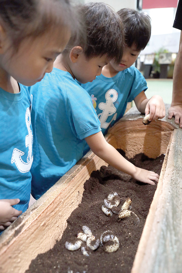 28일 고양시 일산 호수공원에서 열린 ‘고양가을꽃축제’에서 어린이들이 장수풍뎅이 애벌레를 만지는 체험활동을 하고 있다. /연합뉴스