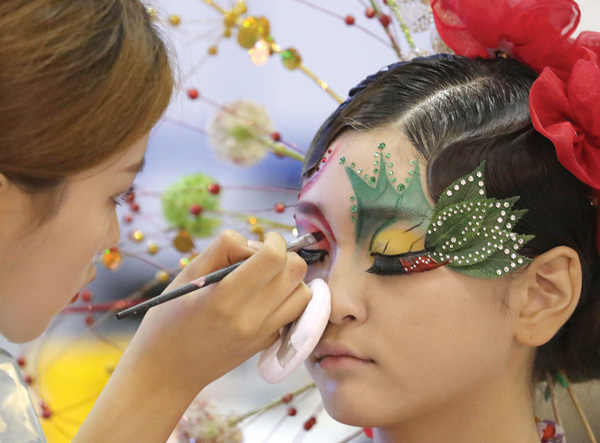 29일 고양시 킨텍스에서 개막한 소상공인 기능 경진대회의 국제메이크업 경진대회에서 참가자들이 모델에게 분장을 하고 있다. /연합뉴스