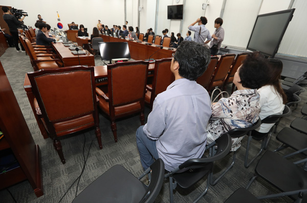 4일 오후 국회 본청에서 열린 가습기살균제 사고 진상규명과 피해구제 및 재발방지 대책 마련을 위한 국정조사특별위원회의 마지막 전체회의에서 피해자 가족들이 회의를 바라보고 있다./연합뉴스
