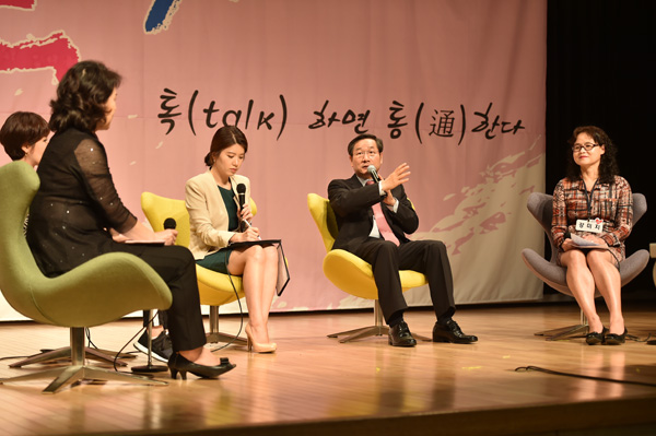 4일 서부여성회관 2층 대강당에서 열린 ‘행복 톡톡콘서트’에서 유정복 시장이 ‘인천의 행복’에 대해 말하고 있다./인천시 제공