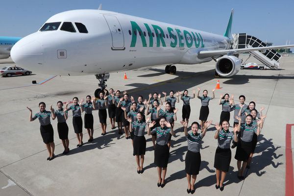 7일부터 국제선 첫 운항을 시작하는 저비용항공사 에어서울의 항공기 1호기가 5일 오전 인천공항에 도착했다. 에어서울 승무원들이 5일 인천공항 계류장에서 열린 항공기 도입식에서 기념세레모니를 하고 있다. 에어서울의 항공기는 7일 일본 다카마쓰에 첫 취항한다./연합뉴스
