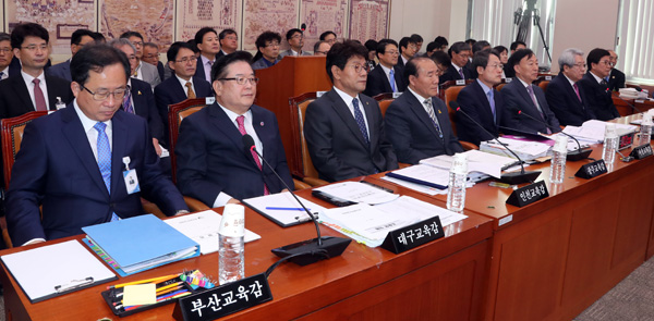 조희연 서울시교육감(왼쪽에서 다섯번째)을 비롯한 각 시도 교육감들이 6일 오전 국회에서 열린 국회 교문위의 서울시교육청 등 각 시도 교육청에 대한 국정감사에 출석하고 있다. 왼쪽부터 김석준 부산교육감, 우동기 대구교육감, 이청연 인천교육감, 장휘국 광주교육감, 조희연 서울교육감, 설동호 대전교육감, 김복만 울산교육감, 최교진 세종교육감./연합뉴스