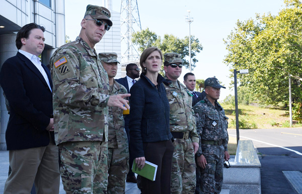 서맨사 파워 유엔주재 미국 대사(왼쪽 세 번째)가 9일 오후 파주시 비무장지대 내 판문점을 방문해 군 관계자에게 설명을 듣고 있다. 파워 대사는 취임 후 처음으로 한국을 찾았다./연합뉴스
