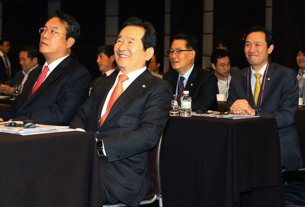 정세균 국회의장과 새누리당 정진석, 더불어민주당 우상호, 국민의당 박지원 원내대표가 10일 오전 서울 소공동 웨스틴조선호텔에서 열린 J글로벌·채텀하우스·여시재 포럼에 나란히 참석해 인사를 나눈 뒤 연사들의 발언을 듣고 있다./연합뉴스