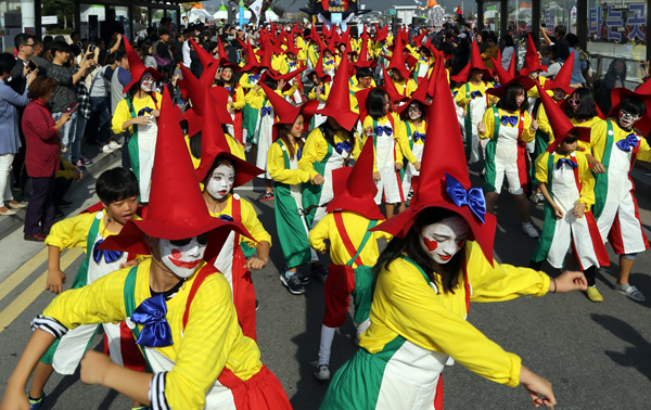 지난 15일 가평군 가평역 앞에서 참여형 거리축제 '까르네발레 가평' 행사가 열려 참가자들이 이국적 의상을 차려입고 축제를 즐기고 있다. /가평군 제공