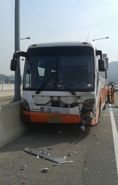 지난 15일 오전 11시쯤 봉담-동탄고속도로 봉담방면 9.3㎞지점 서오산 분기점 인근에서 편도 2차로 중 1차선을 주행하던 오모(50)씨의 1톤 트럭이 2차선 후미에서 달려오던 박모(48)씨의 고속버스 좌측을 들이받았다. 사고 충격으로 고속버스가 우측 갓길 가드레일을 들이받는 바람에 버스 출입문이 열리지 않아 승객 28명이 한동안 버스 안에 갇혀 있었다. 승객들은 다행히 소방대원들에 의해 모두 구조됐다. 사진은 사고 난 버스. /오산소방서 제공