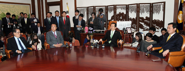 31일 오전 국회의장 주재로 열린 여야 3당 원내대표 회동에서 참석자들이 굳은 표정으로 앉아 있다. 왼쪽부터 국민의당 박지원 비대위원장, 새누리당 정진석 원내대표, 정세균 국회의장, 더불어민주당 우상호 원내대표./연합뉴스