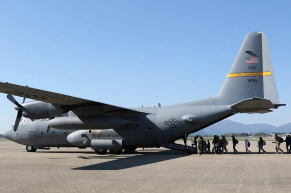 주한미군이 북한의 공격 등 유사시 한국에 거주하는 미국 민간인을 대피시키는 ‘커레이저스 채널’ 훈련을 최근 실시했다. 이 훈련은 연례적으로 이뤄지지만 올해는 북한의 핵·미사일 위협이 가시화되면서 7년 만에 일부 민간인을 실제로 주일 미군기지까지 이동시키는 등 훈련 강도를 크게 높인 것으로 전해졌다. 사진은 민간인 대피훈련인 ‘커레이저스 채널’에 참여하고 있는 주한미군 가족들이 한반도를 떠나기 위해 C-130 수송기에 탑승하는 모습./연합뉴스