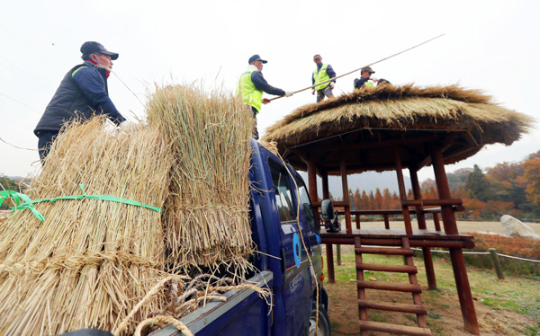 10일 오후 인천시 남동구 인천대공원에서 공원 근로자들이 원두막의 이엉을 교체하며 겨울을 준비하고 있다. /연합뉴스