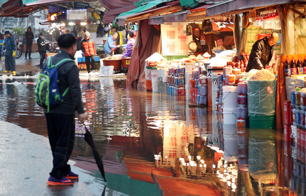 지구와 달이 가장 가까워지며 보름달이 가장 크게 보이는 ‘슈퍼문’이 전망된 14일 오후 인천시 남동구 소래포구 어시장에 바닷물이 차오르면서 하수관이 역류, 바닥에 물이 차오르고 있다. /연합뉴스