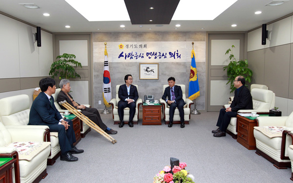 경기도의회 정기열 의장(더불어민주당·안양4)이 14일 경기도의회 의장 접견실에서 도내 장애인 복지 관련협회 회장단을 만나 장애인의 복지현황에 대한 이야기를 나누고 있다./경기도의회 제공