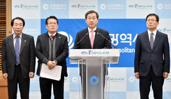 유정복 인천시장이 17일 시청 영상회의실에서 검단 스마트시티 협상 종료 기자회견을 하고 있다. /인천시 제공