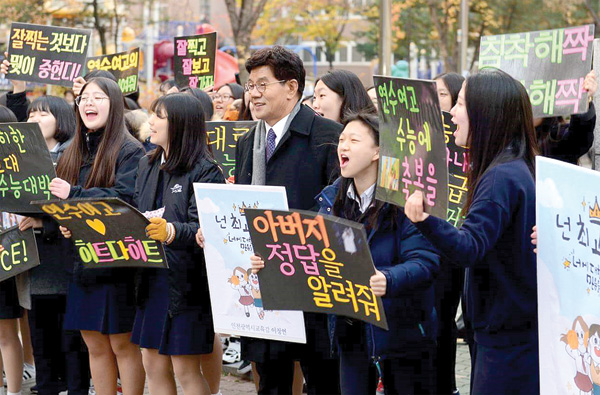 이청연 인천시교육감이 17일 대학수학능력시험이 치러진 연수여고를 찾아 수험생들을 격려하고 있다. /인천시교육청 제공