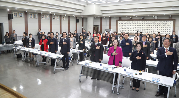 22일 경기도의회 대회의실에서 열린 ‘여성 정치참여 확대를 위한 토론회’에서 정기열 경기도의회 의장과 이재율 경기도 행정1부지사 등이 참석해 국가에 대한 경례를 하고 있다./경기도의회