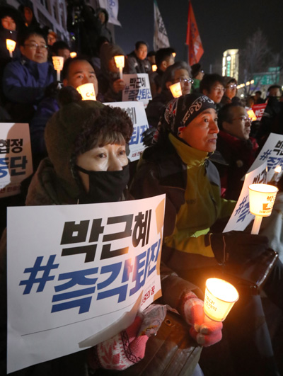 쌀쌀한 날씨를 보인 22일 오후 서울 파이낸스빌딩 앞에서 시민들이 박근혜 대통령의 하야를 촉구하는 촛불집회를 하고 있다./연합뉴스