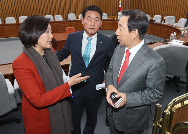 23일 국회에서 열린 박근혜 정부의 최순실 등 민간인에 의한 국정농단 의혹사건 진상규명을 위한 국정조사특별위원회 2차 전체회의에서 김성태 위원장(오른쪽)과 더불어민주당 박영선 의원, 새누리당 황영철 의원이 ‘증인채택’ 문제를 놓고 설전을 벌이고 있다./연합뉴스