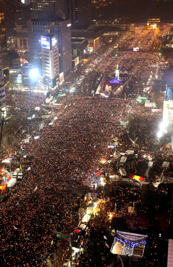 사상 최대규모의 촛불집회가 열린 26일 서울 광화문광장에서 시민들이 박근혜 대통령의 퇴진을 촉구하며 촛불을 밝히고 있다./사진공동취재단