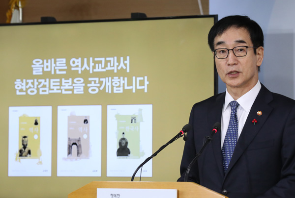 이준식 사회부총리 겸 교육부장관과 김정배 국사편찬위원장은 이날 정부세종청사에서 기자회견을 열고 중학교 역사 1·2, 고등학교 한국사 등 총 3종의 국정 교과서 현장 검토본을 공개했다.