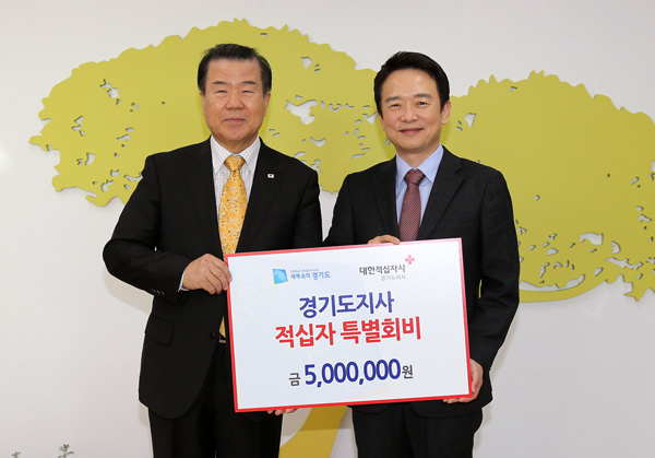 29일 오전 경기도청 도지사 집무실에서 남경필 경기도지사가 김훈동 대한적십자사 경기도지사 회장에게 특별회비를 전달하고 기념촬영을 하고 있다./경기도 제공