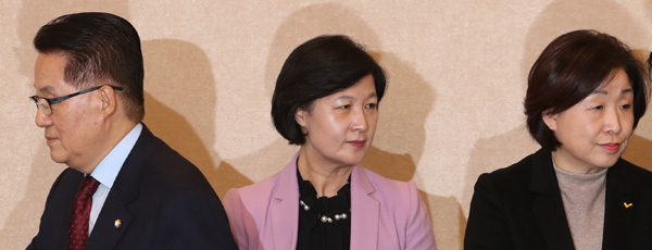 더불어민주당 추미애 대표(가운데), 국민의당 박지원 비상대책위원장 겸 원내대표(왼쪽), 정의당 심상정 상임대표가 1일 오후 국회에서 열린 야3당 대표 회동에 앞서 인사를 나눈 뒤 자리로 향하고 있다./연합뉴스
