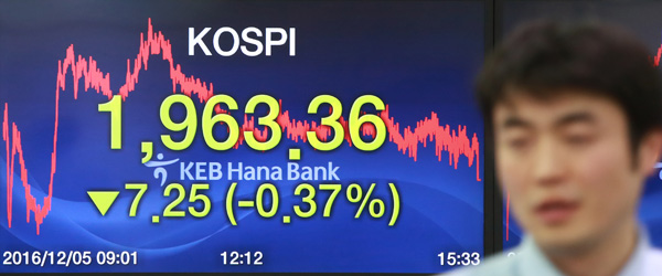 5일 오후 서울 을지로 KEB하나은행 본점 딜링룸의 코스피 현황판이 1,963.36을 가리키고 있다. 이날 코스피지수는 이탈리아의 국민투표 부결로 유로존 탈퇴 우려가 커지며 전 거래일보다 7.25포인트(0.37%) 내린 1,963.36에 장을 마쳤다./연합뉴스