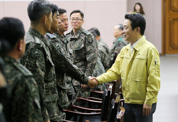 5일 오후 경기도청 신관4층 제1회의실에서 열린 ‘2016 경기도 4/4분기 통합방위협의회’에서 남경필 경기도지사가 통합방위협의회 위원들과 악수를 하고 있다./경기도 제공