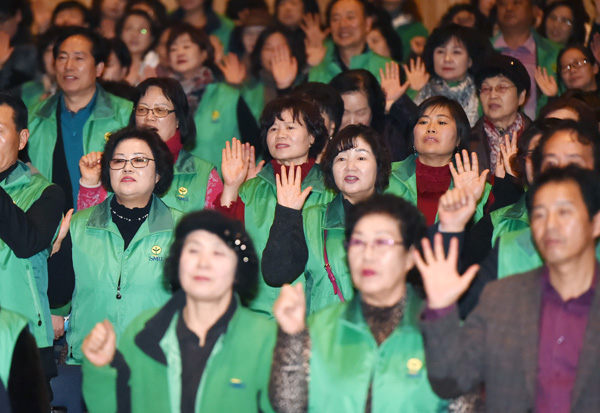 7일 평생학습관에서 열린 ‘2016 인천광역시 새마을지도자대회 및 평가보고회’에서 새마을지도자들이 ‘한자녀 더 갖기 운동’ 다짐을 하고 있다. /인천시 제공