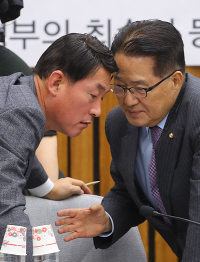 국민의당 박지원 원내대표 7일 오후 국회에서 열린 최순실 국정농단 의혹 진상규명을 위한 국정조사 특위 2차 청문회를 방문해 새누리당 황영철 의원과 대화하고 있다./연합뉴스