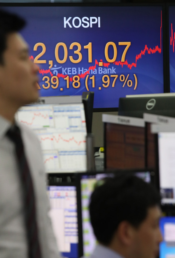 코스피가 크게 올라 2,000선을 가볍게 돌파 39.18포인트 상승한 2,031.07로 장을 마감한 8일 오후 서울 중구 을지로 KEB하나은행 본점 딜링룸에서 딜러들이 업무를 보고 있다./연합뉴스