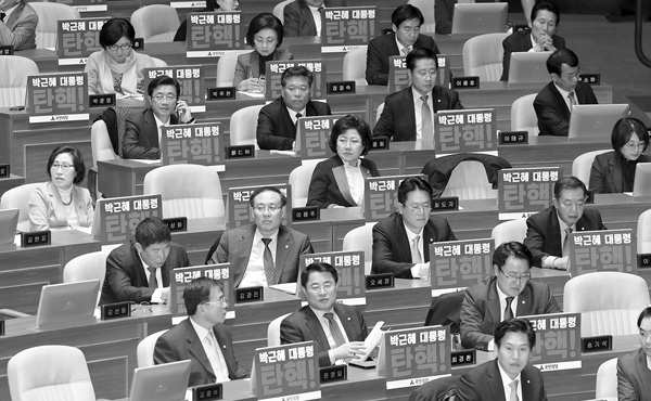 박근혜 대통령에 대한 탄핵표결을 하루 앞둔 8일 오후 국회 본회의장에서 열린 본회의에서 국민의당 안철수-천정배 전 대표 등 의원들이 ‘박근혜 대통령 탄핵!’이라고 쓴 피켓을 앞에 두고 있다./연합뉴스
