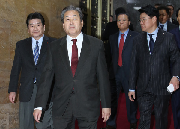 새누리당 김무성 전 대표가 박근혜 대통령 탄핵소추안 표결이 이뤄지는 9일 오후 국회 본회의장으로 들어가고 있다
