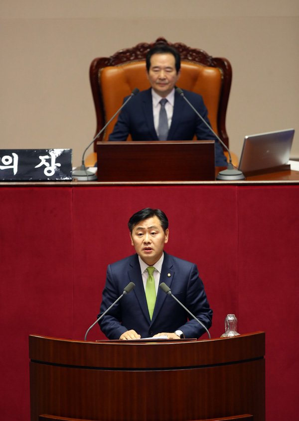 국민의당 김관영 의원이 9일 오후 국회에서 열린 본회의에서 박근혜 대통령 탄핵소추안 제안설명하고 있다./연합뉴스