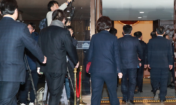 9일 오후 박근혜 대통령 탄핵소추안 표결을 위해 새누리당 의원들이 본회의장에 들어가고 있다.