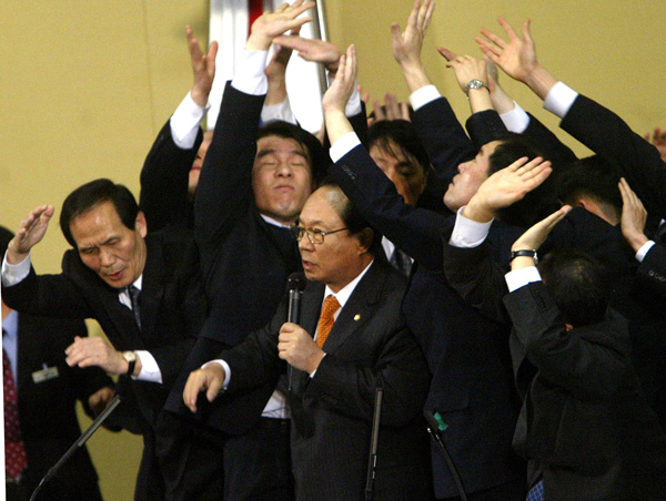 2004년 3월 12일 국회 본회의장에서 박관용 국회의장이 헌정사상 처음으로 대통령 탄핵소추안 가결을 선포하고 있다. 당시 본회의장은 노무현 전 대통령에 대한 탄핵안 표결에 반대하며 의장석을 점거한 여당 의원들과 표결을 강행하려는 야당 의원들 사이에 욕설과 폭력이 난무하는 등 아수라장이 된 모습이었다.