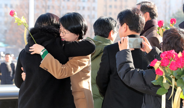 국민의당 박선숙 의원이 9일 오후 국회 본회의장에서 열린 박근혜 대통령의 탄핵소추안에 대한 표결을 위해 입장하다 환경운동연합 등 시민단체 회원들이 전달하는 '탄핵찬성 촉구' 꽃을 받고 있다. 꽃에는 "촛불을 기억하세요". "탄핵에 찬성하세요"란 글귀가 붙어 있다.