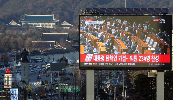 9일 오후 서울 중구 프레스센터 앞 전광판에 박근혜 대통령 탄핵소추안 표결 중계방송이 나오고 있다.