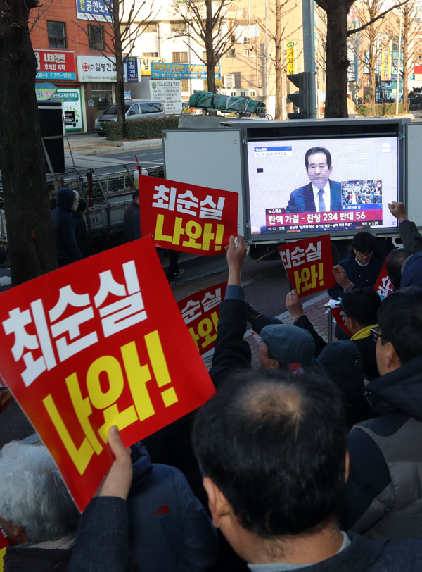 9일 오후 광주 북구 중흥동 새누리당 광주시당 앞에서 박근혜정권 퇴진 광주시민운동본부 회원들이 국회의 대통령탄핵 가결 소식을 방송중계로 지켜보며 환호하고 있다./연합뉴스